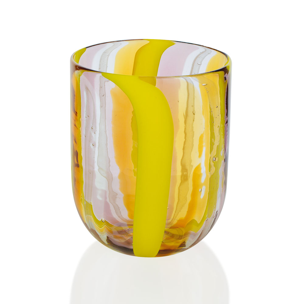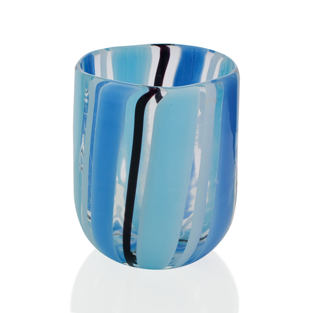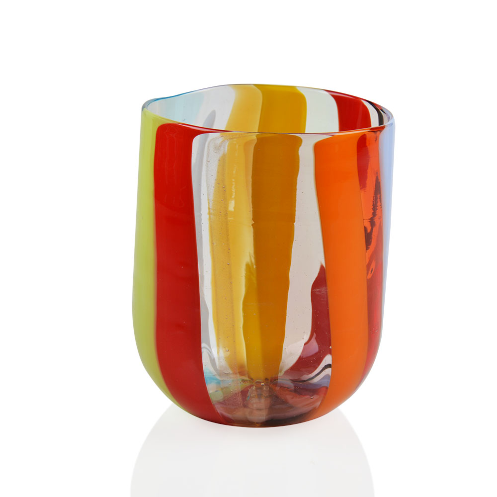 Bicchiere aperto a mano con canne opache e trasparenti, e con murrine disposti in sequenze e dimensioni sempre diverse in forma liscia.