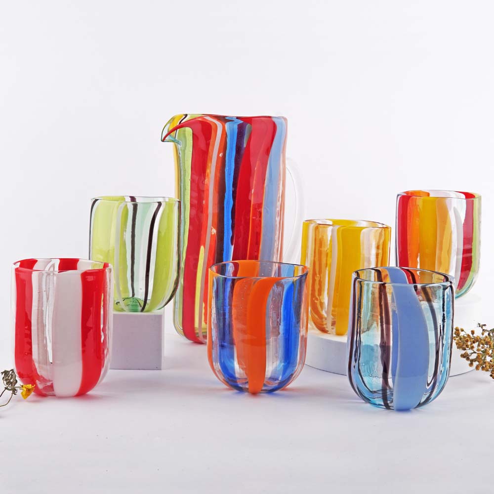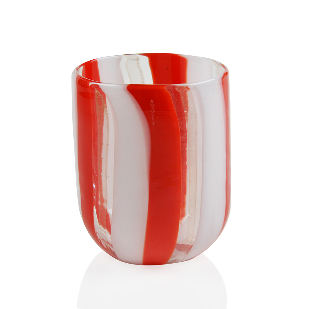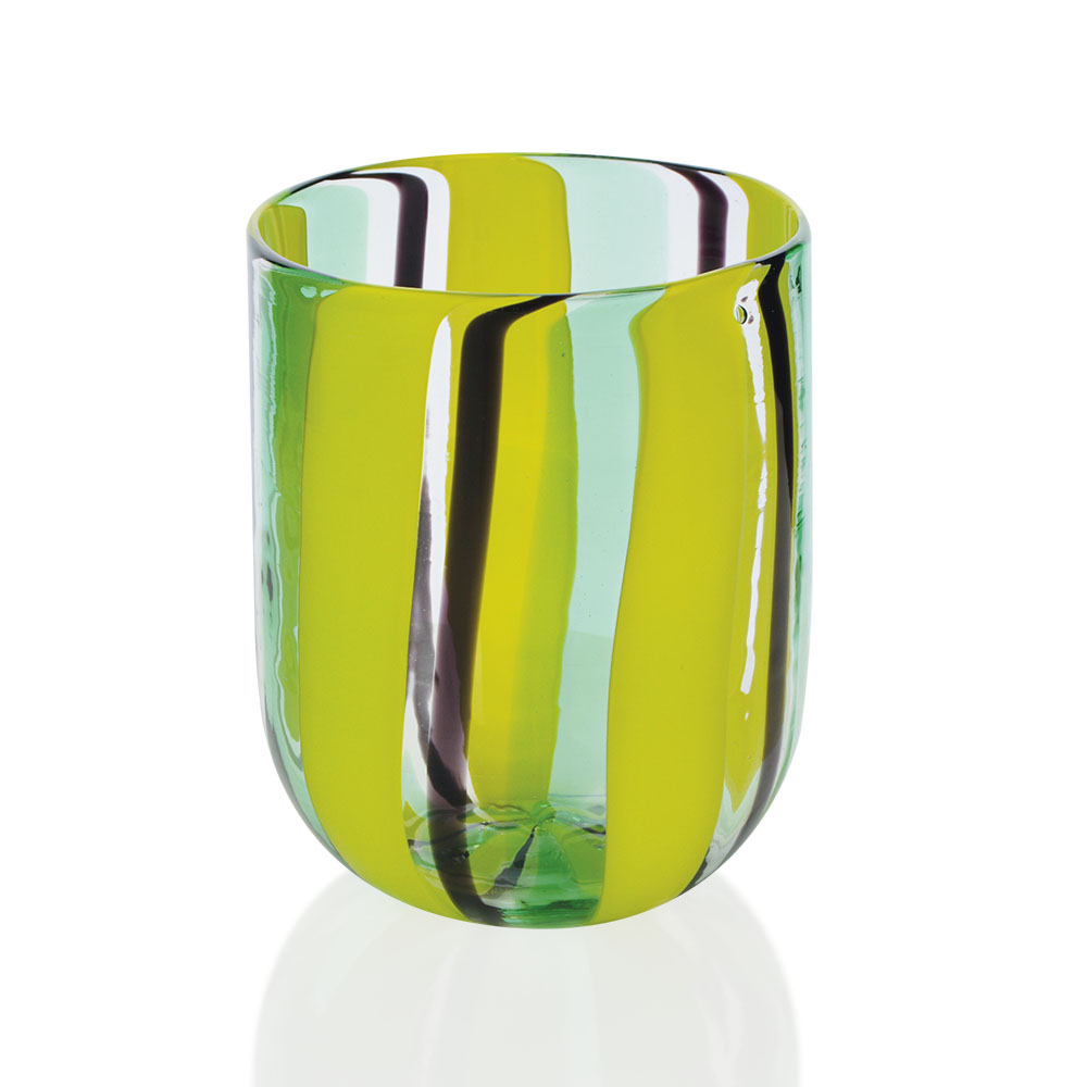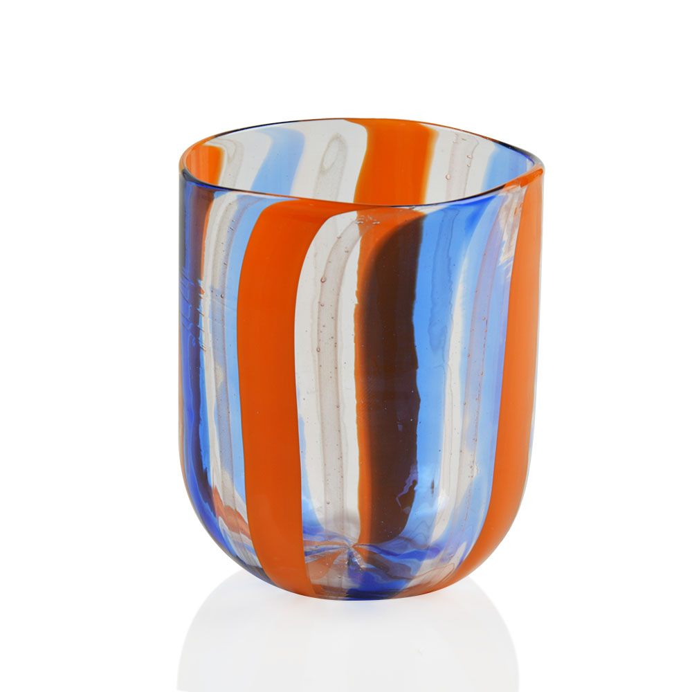 Bicchiere aperto a mano con canne opache e trasparenti, e con murrine disposti in sequenze e dimensioni sempre diverse in forma liscia.