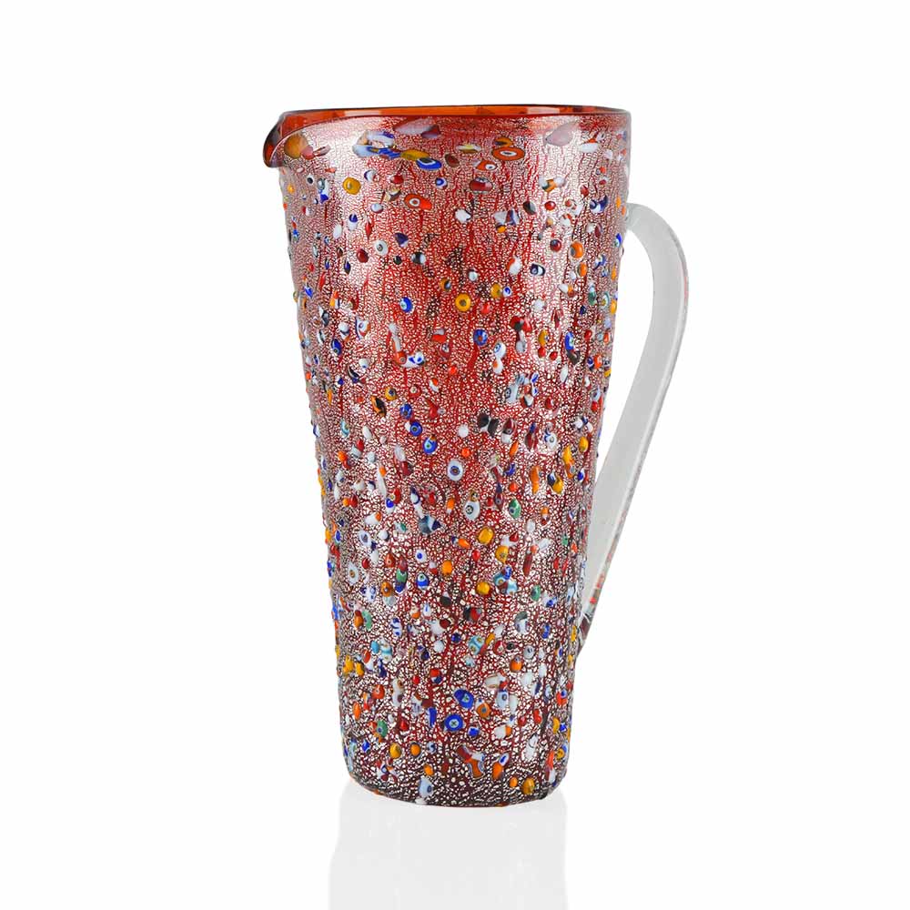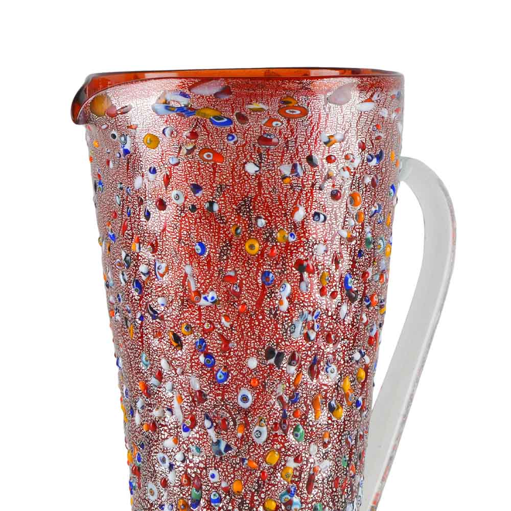 Caraffa aperta a mano trasparente con foglia d’argento e murrine in rilievo a goccia multicolore. Accartocciata.